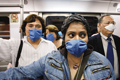 墨西哥城的地铁车厢,人人都戴口罩防猪流感。